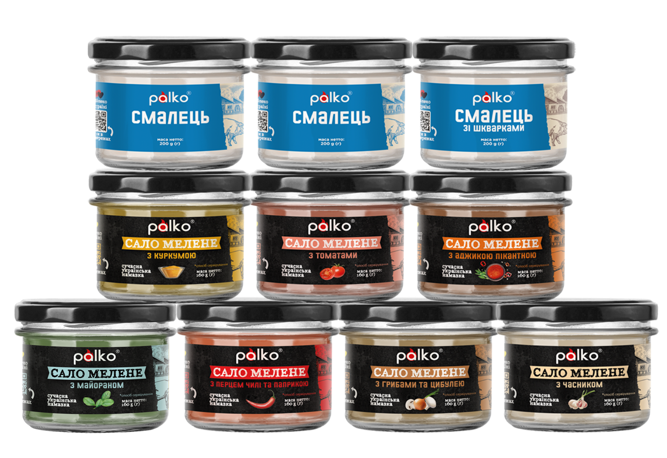 Мелене сало: з часником, з грибами та цибулею, з перцем чилі та паприкою, з базиліком та імбирем, з майораном, з куркумою + смалець звичайний і смалець зі шкварками